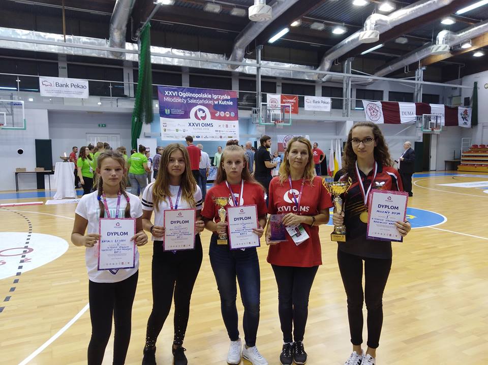 W dniach od 14 do 16 września 2018 r. odbyły się w Kutnie XXVI Ogólnopolskie Igrzyska Młodzieży Salezjańskiej. Na miejskich obiektach rywalizowała młodzież w kilku dyscyplinach sportowych, w 3 grupach wiekowych z podziałem na dziewczęta i chłopców. Dwukrotną złotą medalistką Igrzysk w tenisie stołowym została nasza absolwentka Milena Dyja. Dobre wyniki uzyskały także w najmłodszej grupie wiekowej tenisistki z naszej szkoły, podopieczne Katarzyny Dyja. III miejsce i brąz w grze deblowej zdobyła Michalina Topolewska grając w parze z zawodniczką z Kutna. Tuż za podium na miejscu IV znalazły się Oliwia Kuligowska i Natalia Lejman. W grach pojedynczych szczęśliwy był dla dziewcząt pierwszy dzień rozgrywek. Oliwia wyszła z grupy wygrywając wszystkie gry, a Natalia z jedną porażką. Ostatecznie dziewczętom nie udało się stanąć na podium, choć do zwycięstwa zabrakło niewiele, gdyż zajęły V i VI miejsce. Zwycięzcy poszczególnych konkurencji uhonorowani zostali medalami i pucharami oraz pamiątkowymi dyplomami.