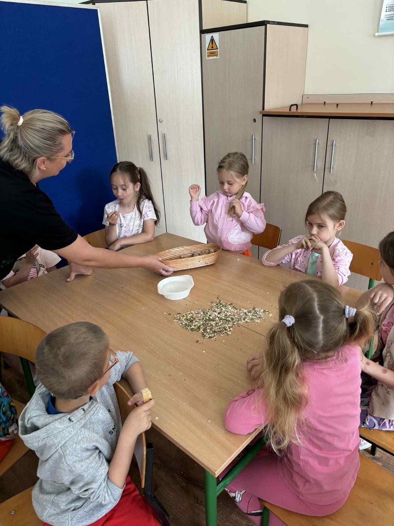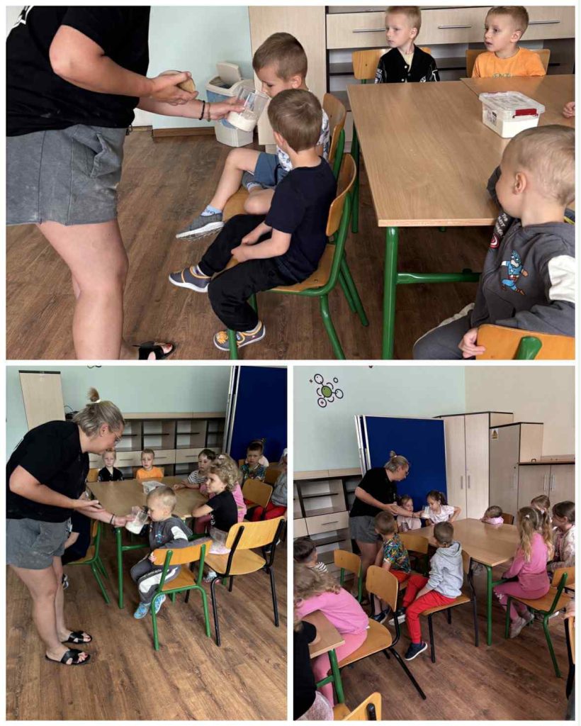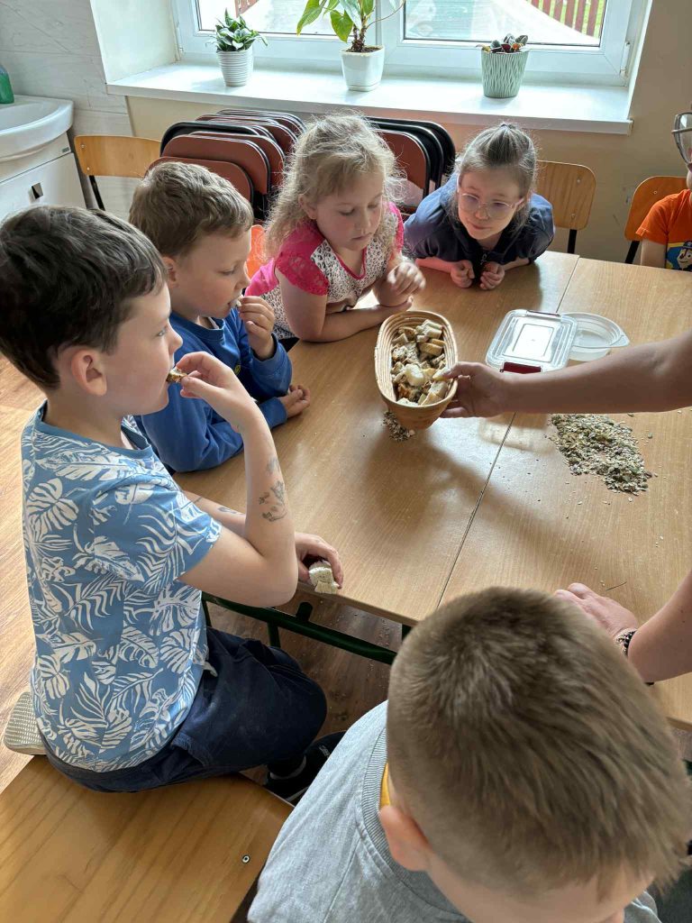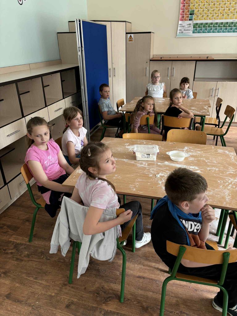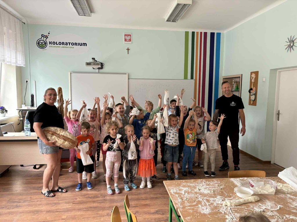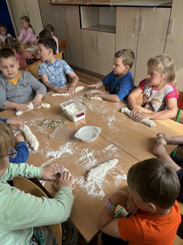 Pod czujnym okiem prowadzących najmłodsi uczniowie poznali podstawowe składniki pieczywa, dowiedzieli się, jak powstaje chleb oraz dlaczego praca piekarza zaczyna się jeszcze przed wschodem słońca.