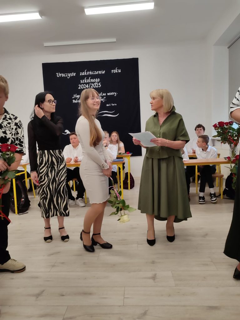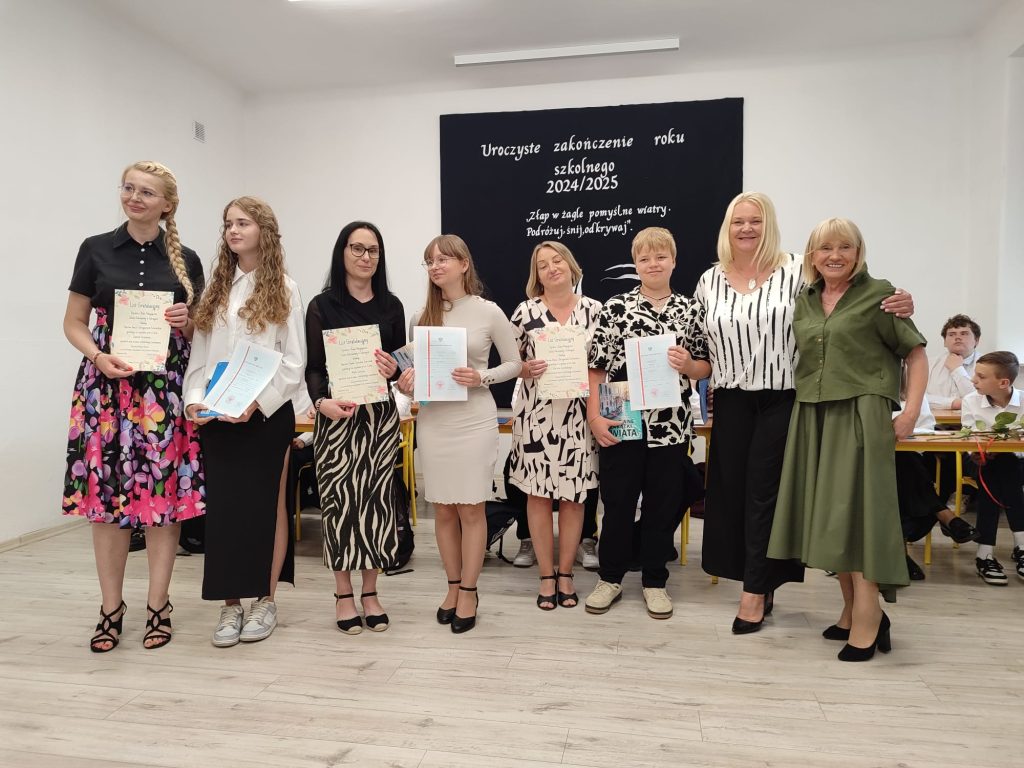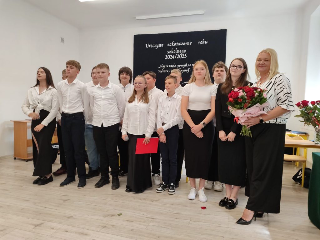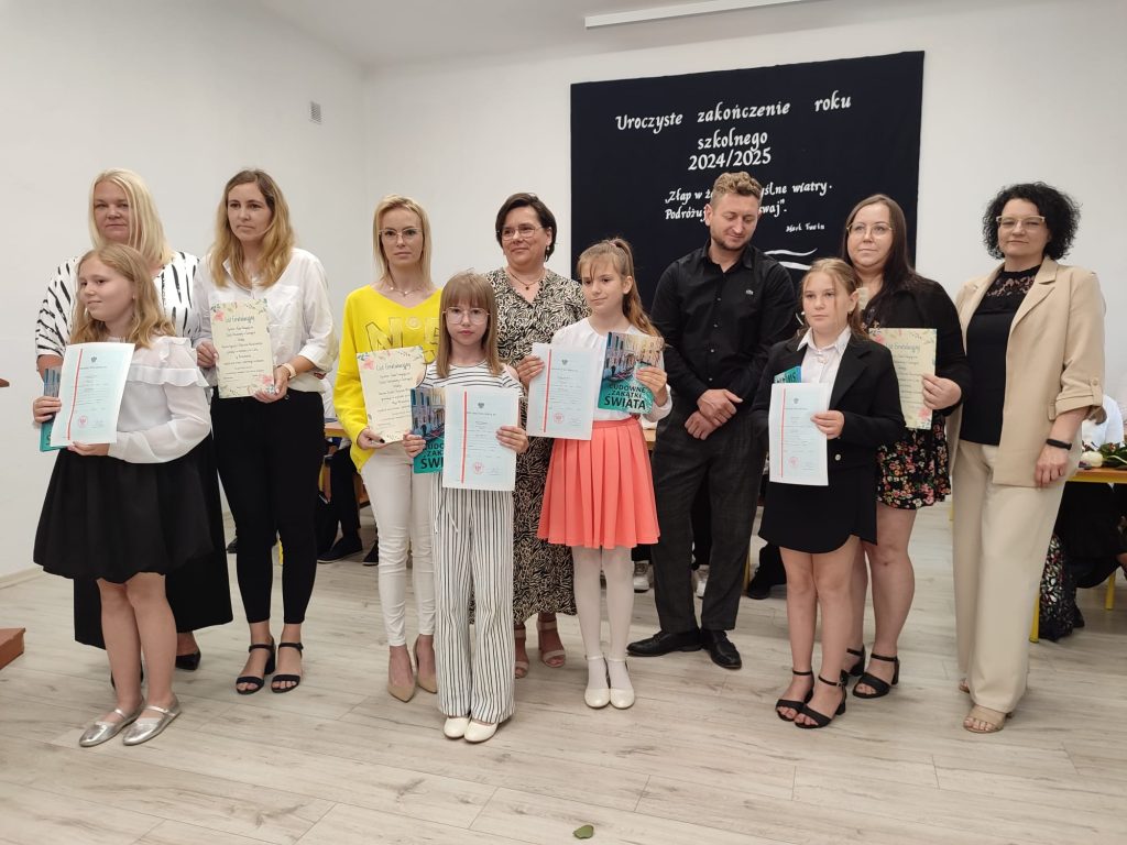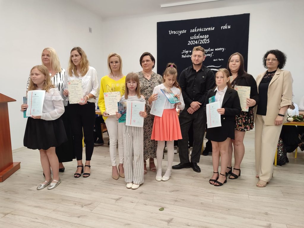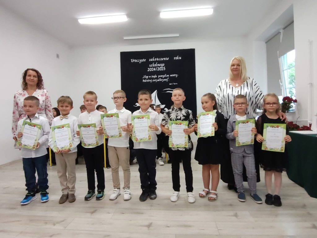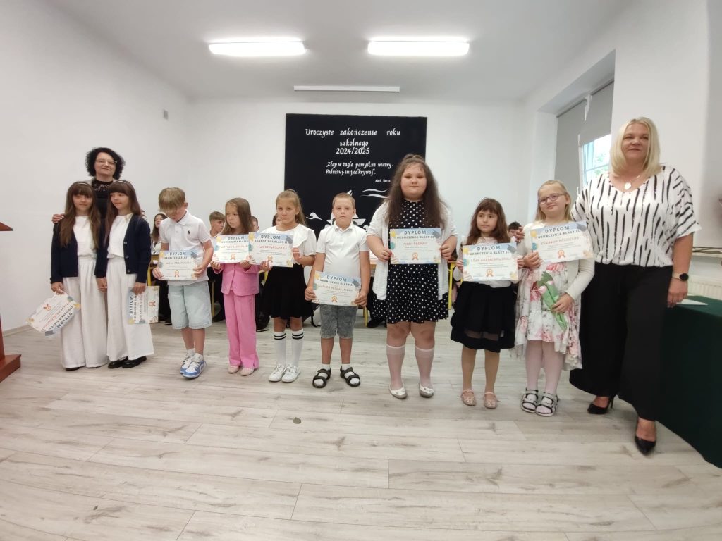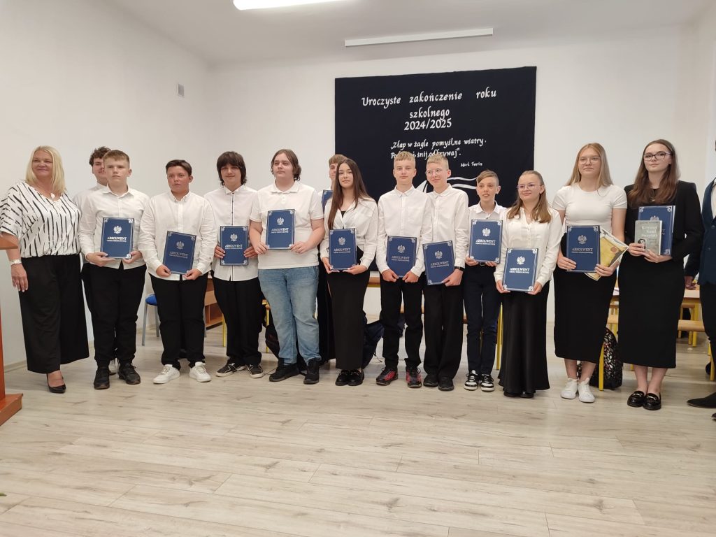 27 czerwca 2025 roku odbyło się w naszej szkole uroczyste zakończenie roku szkolnego 2024/2025. Dyrekcja, Nauczyciele, Pracownicy Administracji i Obsługi oraz uczniowie klas I – VIII zebrali się na świetlicy, gdzie odbyła się uroczystość związana z pożegnaniem uczniów klasy VIII. Było to szczególne pożegnanie. Sekretarz – Pan Arkadiusz Klimowski wręczył Nagrodę Wójta Gminy Sierpc za wybitne wyniki w nauce i godne reprezentowanie szkoły uczennicy VIII klasy – Ewelinie Olszewskiej. Pani Dyrektor w swoim przemówieniu pożegnała odchodzących uczniów oraz złożyła podziękowania i życzenia Pracownikom Szkoły, Rodzicom. Po przemówieniach wręczono statuetki, świadectwa oraz nagrody. Wszyscy uczniowie klasy ósmej otrzymali świadectwo ukończenia szkoły. Uczuciu radości towarzyszyła refleksja, że to już pora pożegnania ze szkołą, z wychowawcą, nauczycielami i rówieśnikami. Następnie absolwenci w programie artystycznym ze sporą dozą humoru przedstawili migawki ze szkolnego życia oraz podziękowania dla rodziców, nauczycieli i pracowników szkoły. Na zakończenie wychowawcy klas wręczyli uczniom klas I – VII świadectwa w klasach.