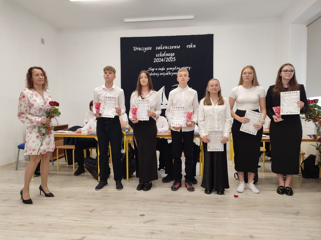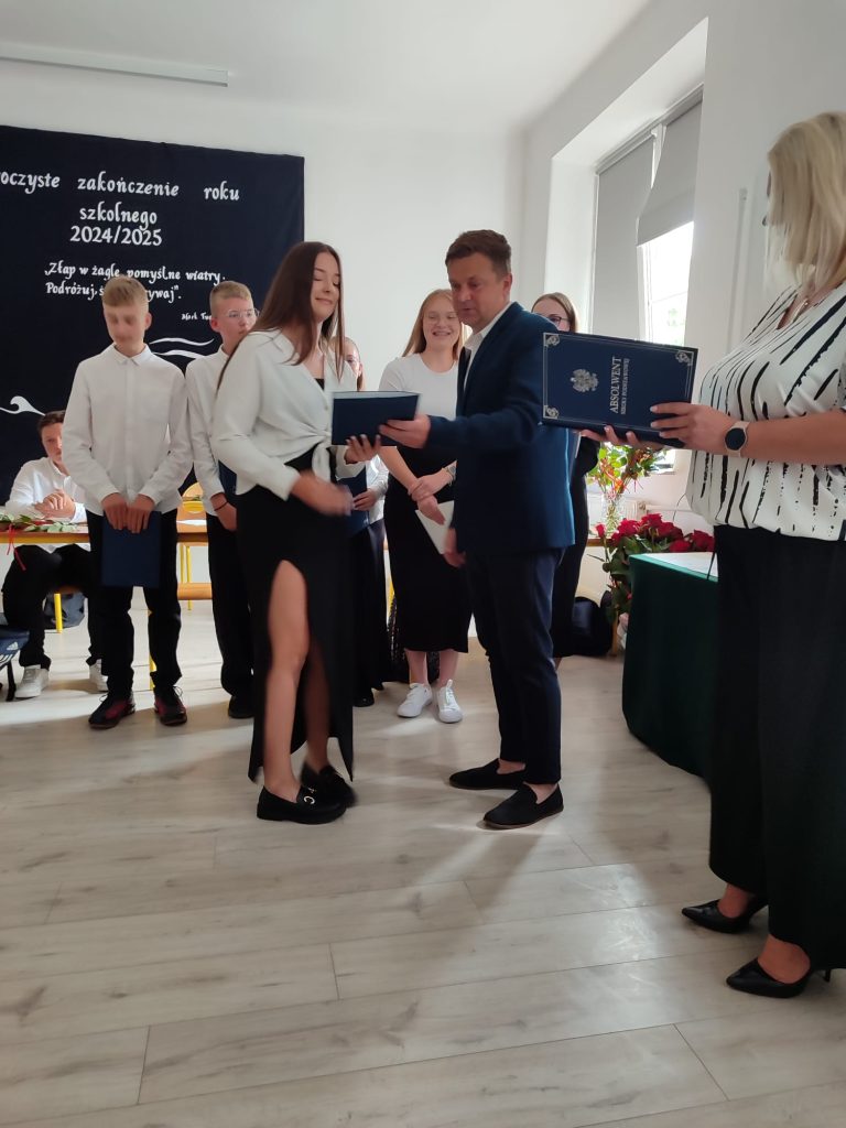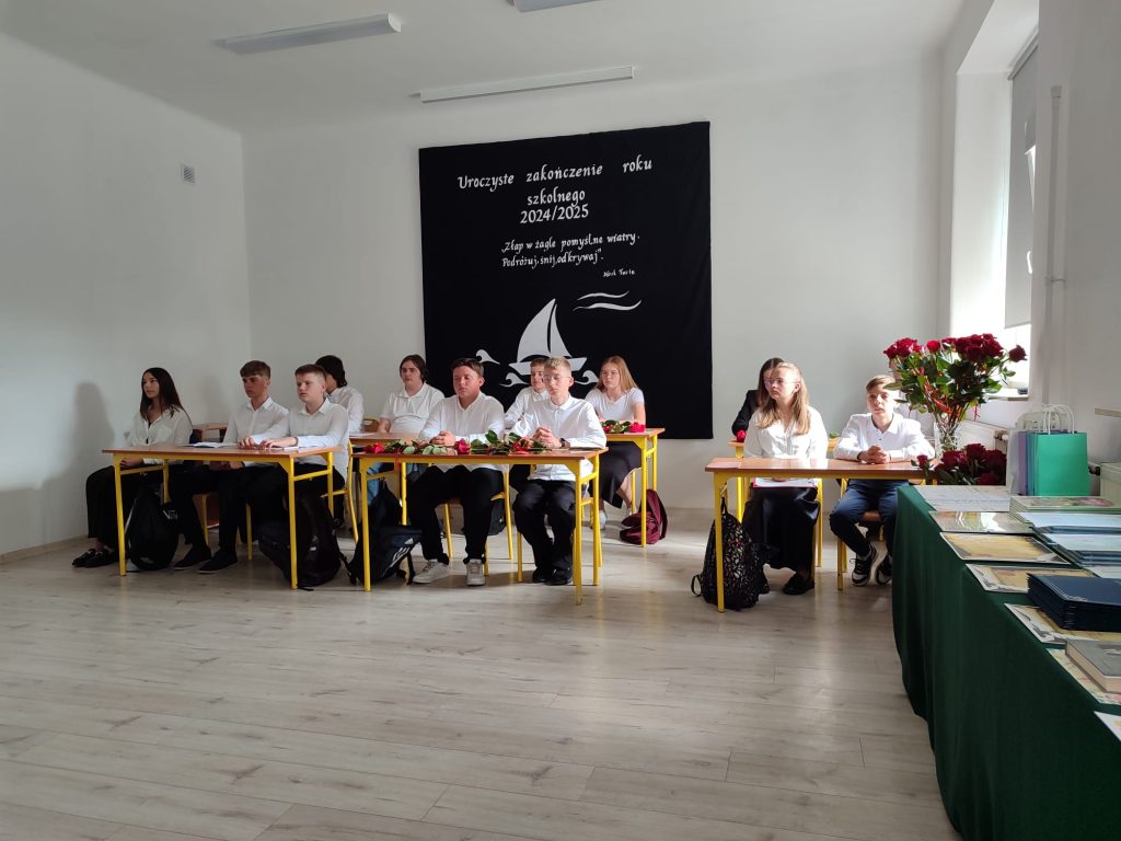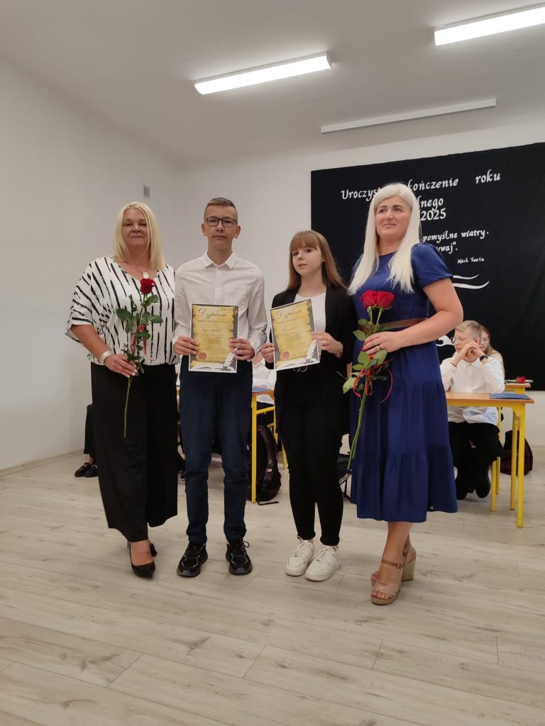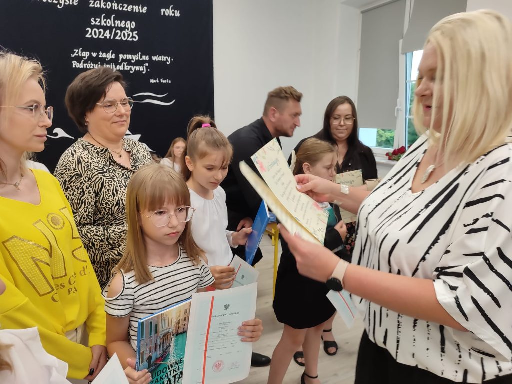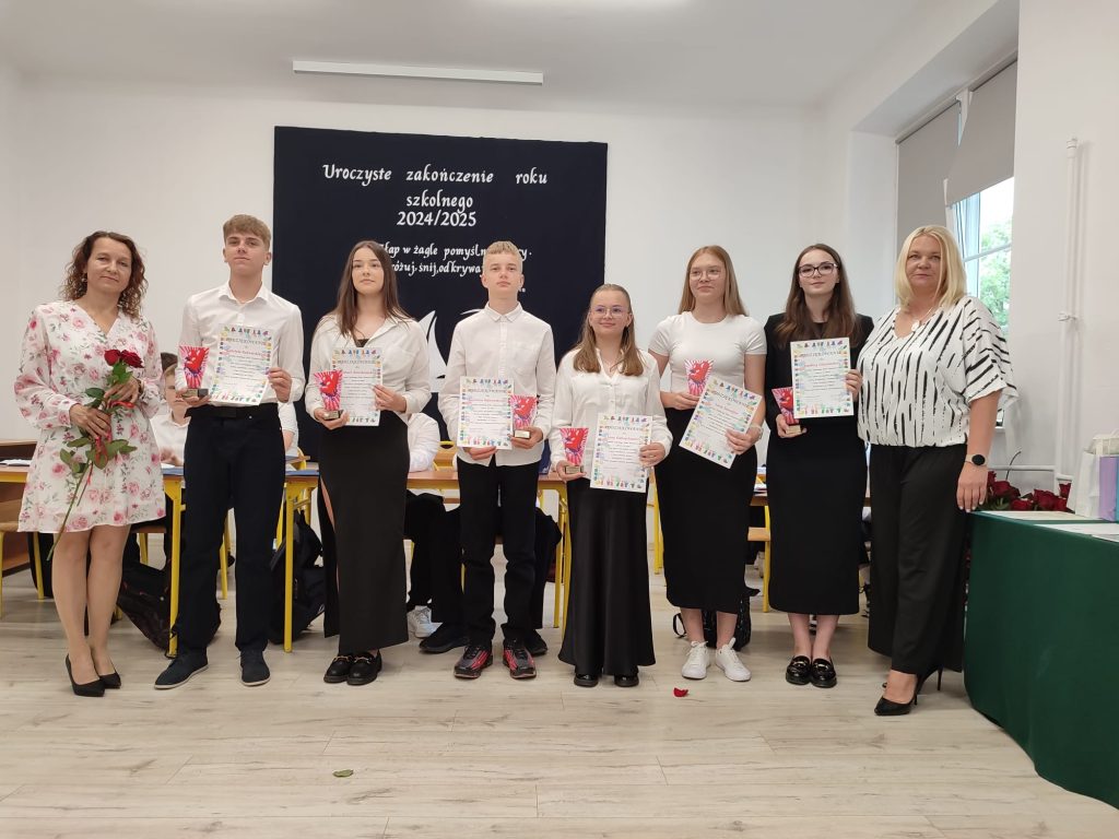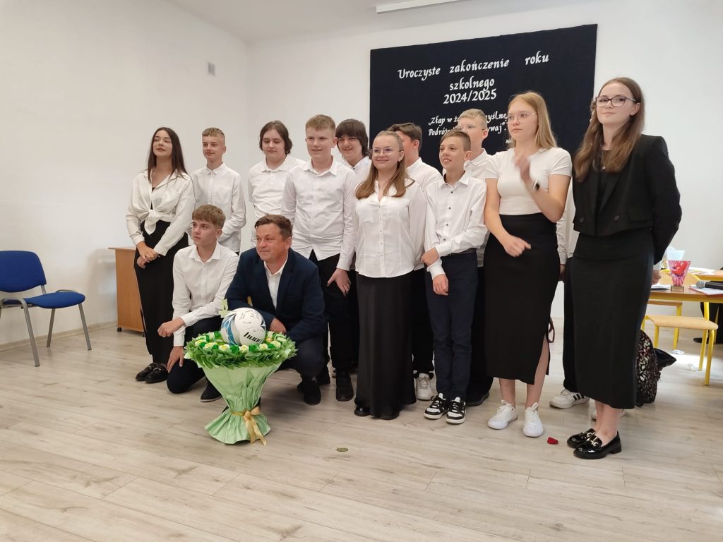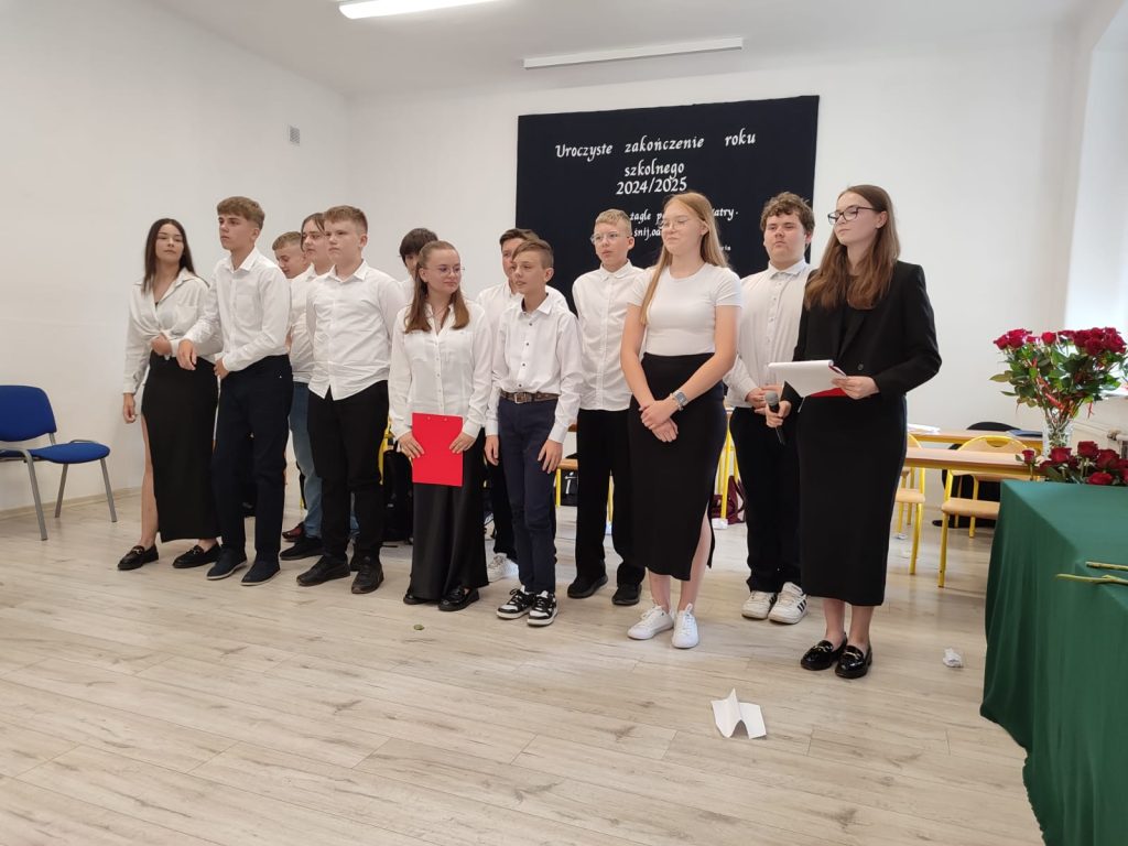 27 czerwca 2025 roku odbyło się w naszej szkole uroczyste zakończenie roku szkolnego 2024/2025. Dyrekcja, Nauczyciele, Pracownicy Administracji i Obsługi oraz uczniowie klas I – VIII zebrali się na świetlicy, gdzie odbyła się uroczystość związana z pożegnaniem uczniów klasy VIII. Było to szczególne pożegnanie. Sekretarz – Pan Arkadiusz Klimowski wręczył Nagrodę Wójta Gminy Sierpc za wybitne wyniki w nauce i godne reprezentowanie szkoły uczennicy VIII klasy – Ewelinie Olszewskiej. Pani Dyrektor w swoim przemówieniu pożegnała odchodzących uczniów oraz złożyła podziękowania i życzenia Pracownikom Szkoły, Rodzicom. Po przemówieniach wręczono statuetki, świadectwa oraz nagrody. Wszyscy uczniowie klasy ósmej otrzymali świadectwo ukończenia szkoły. Uczuciu radości towarzyszyła refleksja, że to już pora pożegnania ze szkołą, z wychowawcą, nauczycielami i rówieśnikami. Następnie absolwenci w programie artystycznym ze sporą dozą humoru przedstawili migawki ze szkolnego życia oraz podziękowania dla rodziców, nauczycieli i pracowników szkoły. Na zakończenie wychowawcy klas wręczyli uczniom klas I – VII świadectwa w klasach.