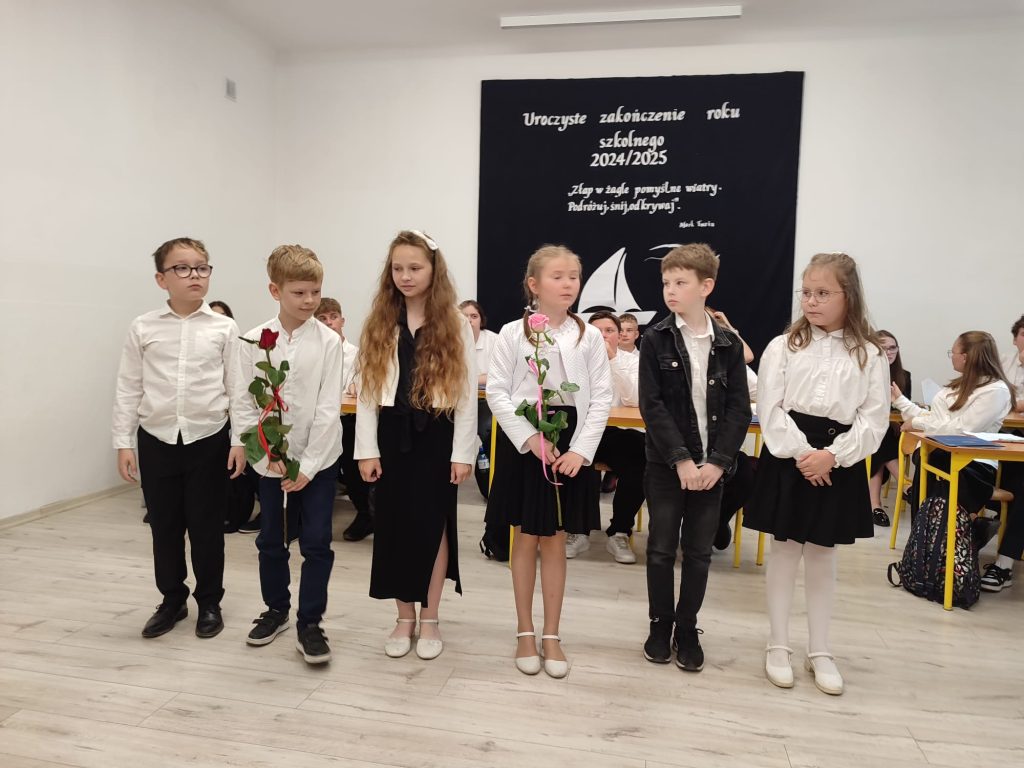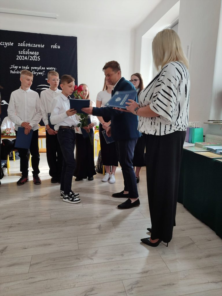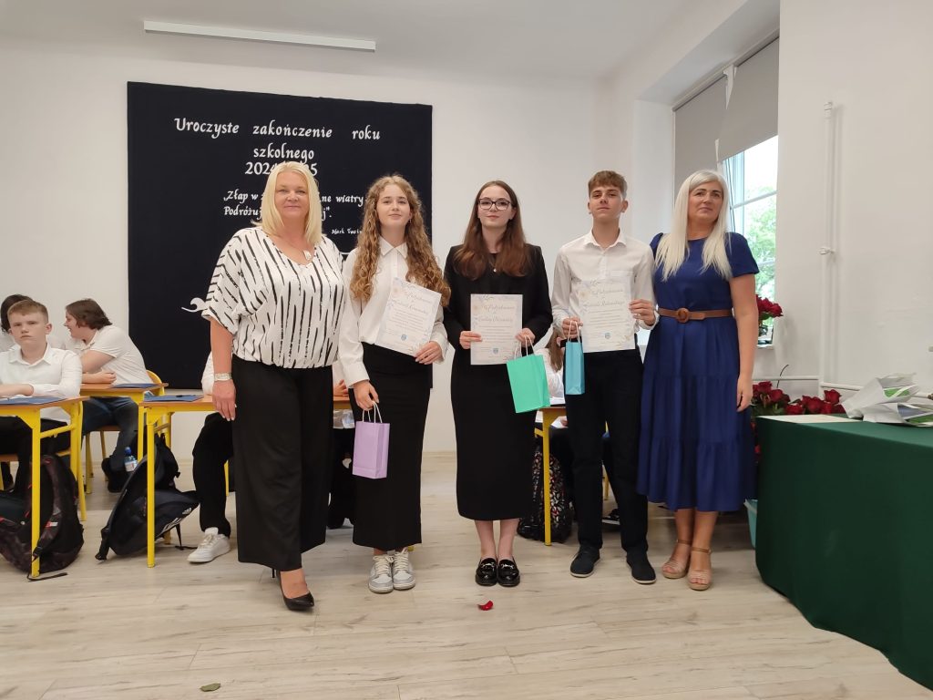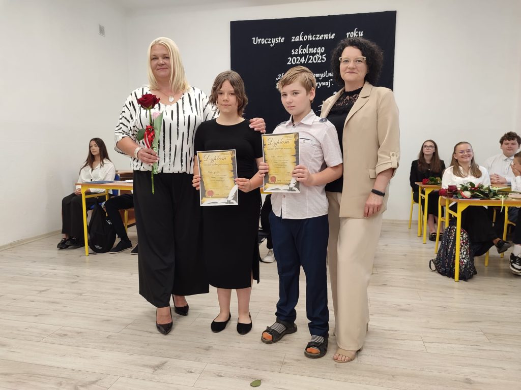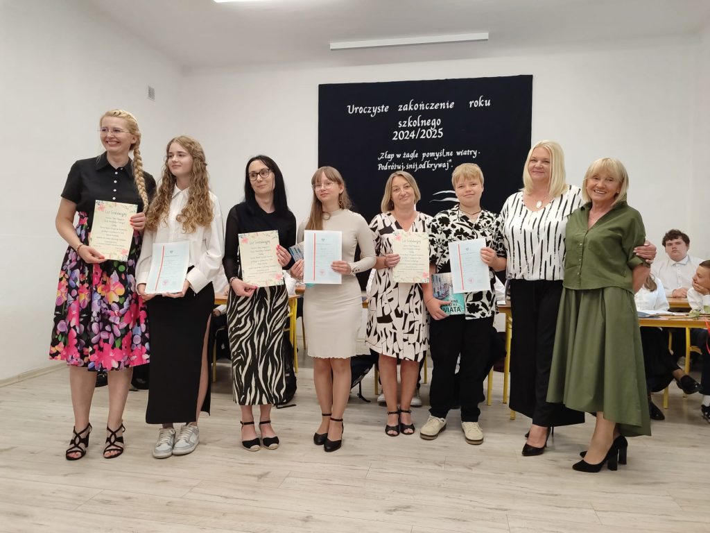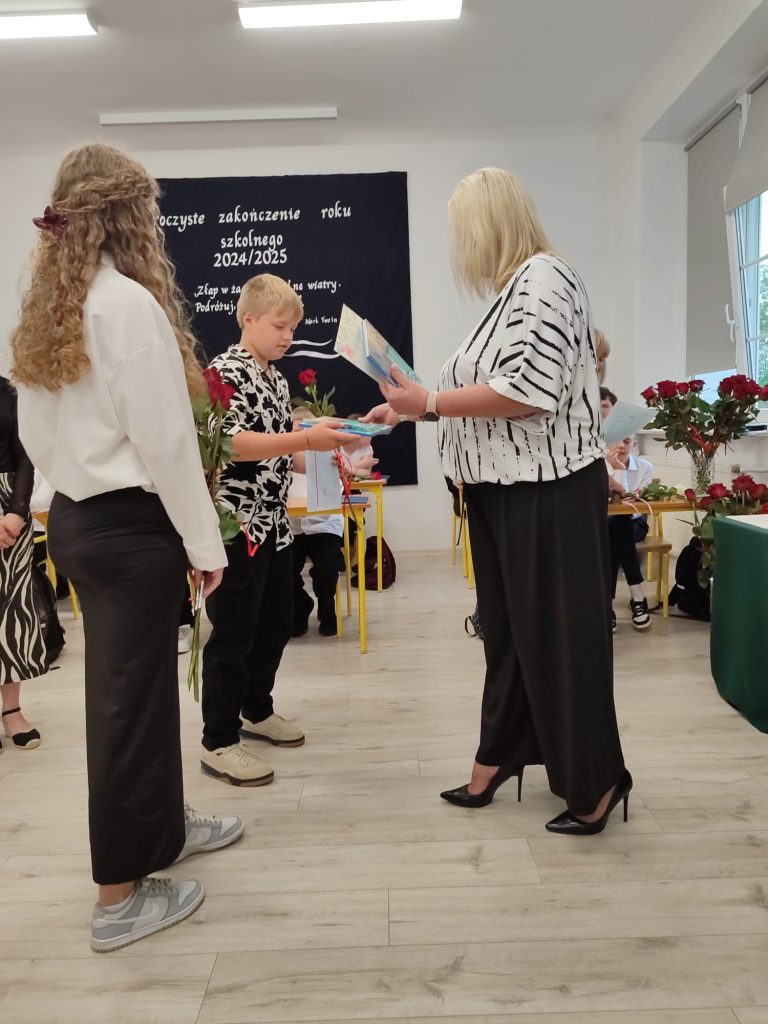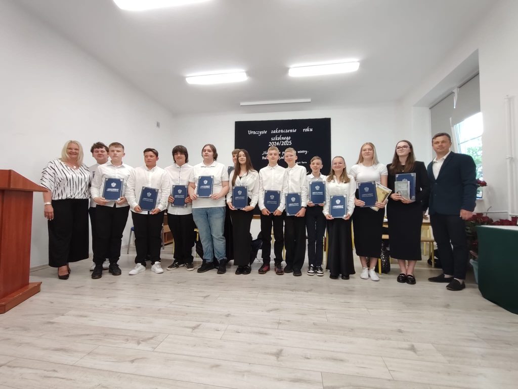 27 czerwca 2025 roku odbyło się w naszej szkole uroczyste zakończenie roku szkolnego 2024/2025. Dyrekcja, Nauczyciele, Pracownicy Administracji i Obsługi oraz uczniowie klas I – VIII zebrali się na świetlicy, gdzie odbyła się uroczystość związana z pożegnaniem uczniów klasy VIII. Było to szczególne pożegnanie. Sekretarz – Pan Arkadiusz Klimowski wręczył Nagrodę Wójta Gminy Sierpc za wybitne wyniki w nauce i godne reprezentowanie szkoły uczennicy VIII klasy – Ewelinie Olszewskiej. Pani Dyrektor w swoim przemówieniu pożegnała odchodzących uczniów oraz złożyła podziękowania i życzenia Pracownikom Szkoły, Rodzicom. Po przemówieniach wręczono statuetki, świadectwa oraz nagrody. Wszyscy uczniowie klasy ósmej otrzymali świadectwo ukończenia szkoły. Uczuciu radości towarzyszyła refleksja, że to już pora pożegnania ze szkołą, z wychowawcą, nauczycielami i rówieśnikami. Następnie absolwenci w programie artystycznym ze sporą dozą humoru przedstawili migawki ze szkolnego życia oraz podziękowania dla rodziców, nauczycieli i pracowników szkoły. Na zakończenie wychowawcy klas wręczyli uczniom klas I – VII świadectwa w klasach.