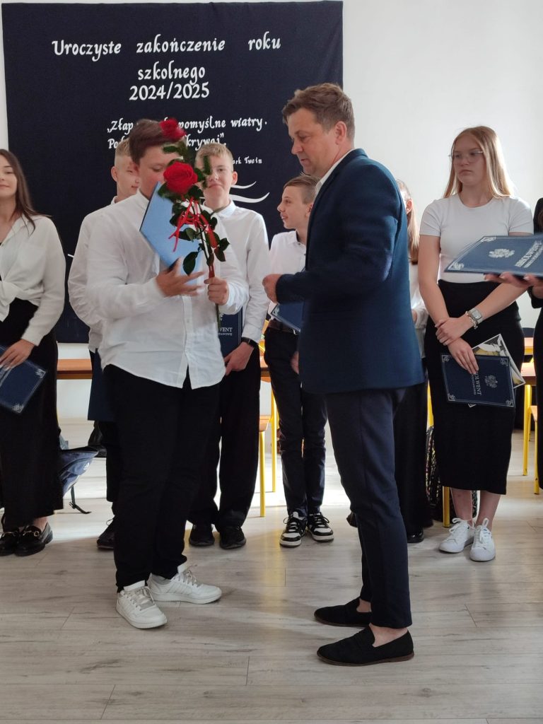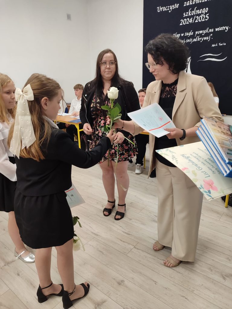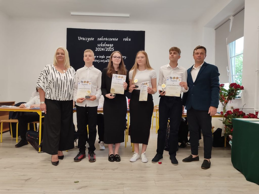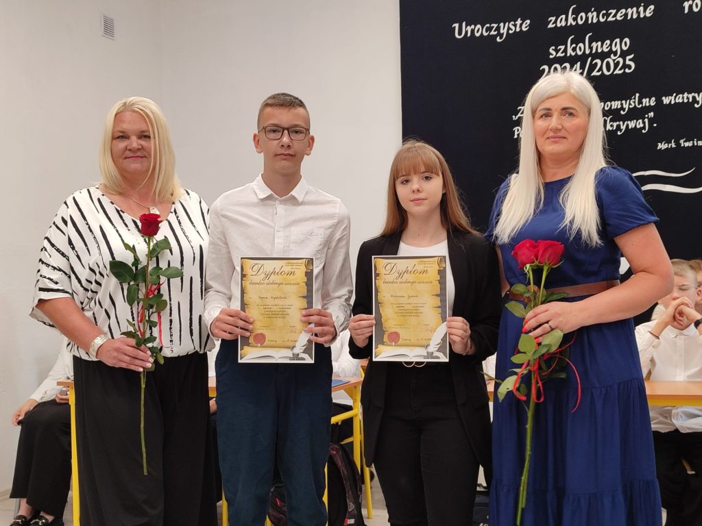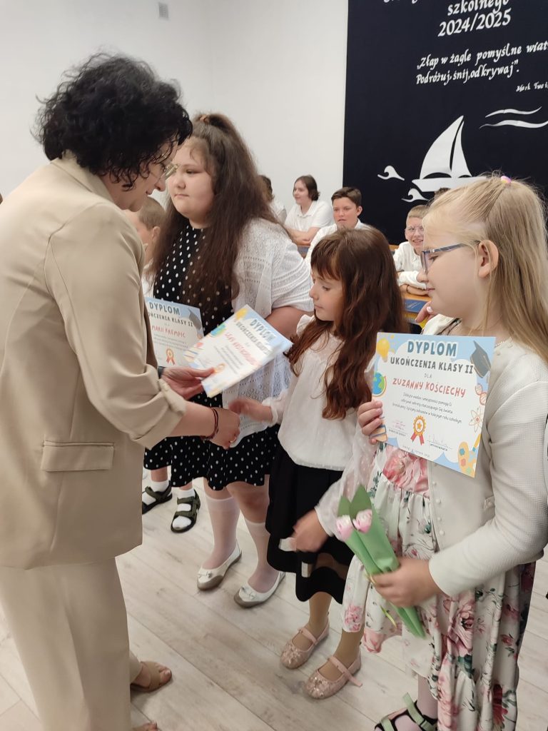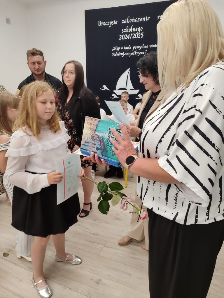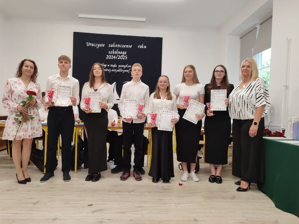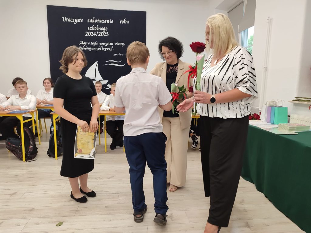 27 czerwca 2025 roku odbyło się w naszej szkole uroczyste zakończenie roku szkolnego 2024/2025. Dyrekcja, Nauczyciele, Pracownicy Administracji i Obsługi oraz uczniowie klas I – VIII zebrali się na świetlicy, gdzie odbyła się uroczystość związana z pożegnaniem uczniów klasy VIII. Było to szczególne pożegnanie. Sekretarz – Pan Arkadiusz Klimowski wręczył Nagrodę Wójta Gminy Sierpc za wybitne wyniki w nauce i godne reprezentowanie szkoły uczennicy VIII klasy – Ewelinie Olszewskiej. Pani Dyrektor w swoim przemówieniu pożegnała odchodzących uczniów oraz złożyła podziękowania i życzenia Pracownikom Szkoły, Rodzicom. Po przemówieniach wręczono statuetki, świadectwa oraz nagrody. Wszyscy uczniowie klasy ósmej otrzymali świadectwo ukończenia szkoły. Uczuciu radości towarzyszyła refleksja, że to już pora pożegnania ze szkołą, z wychowawcą, nauczycielami i rówieśnikami. Następnie absolwenci w programie artystycznym ze sporą dozą humoru przedstawili migawki ze szkolnego życia oraz podziękowania dla rodziców, nauczycieli i pracowników szkoły. Na zakończenie wychowawcy klas wręczyli uczniom klas I – VII świadectwa w klasach.