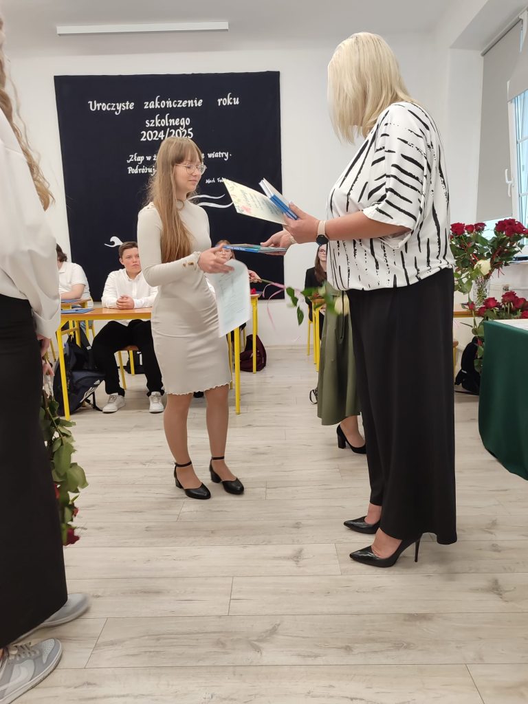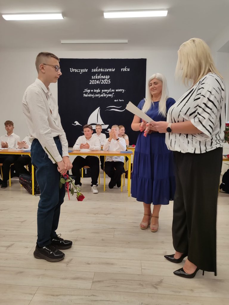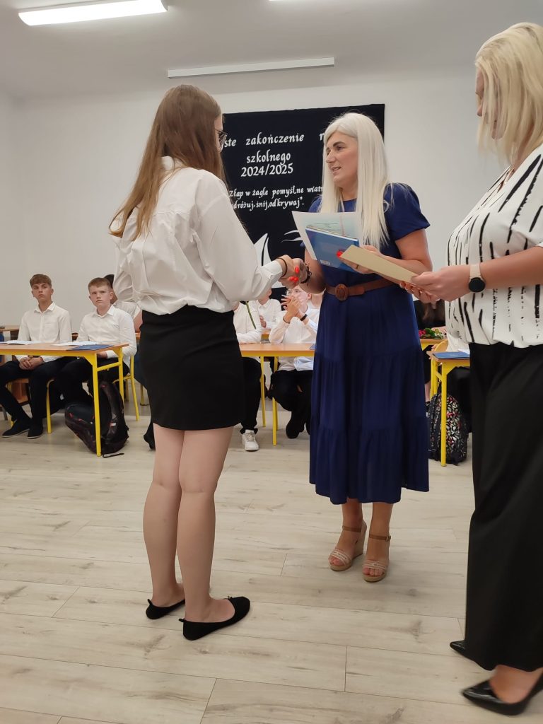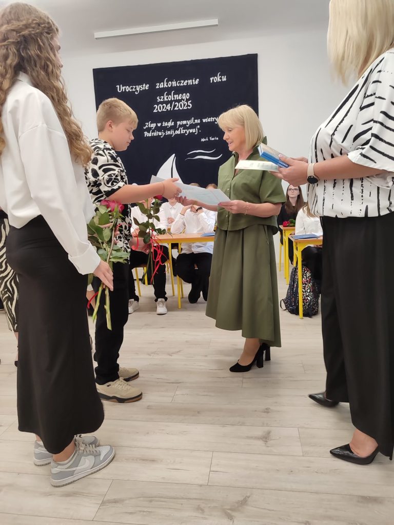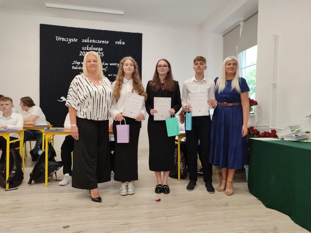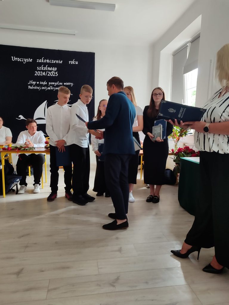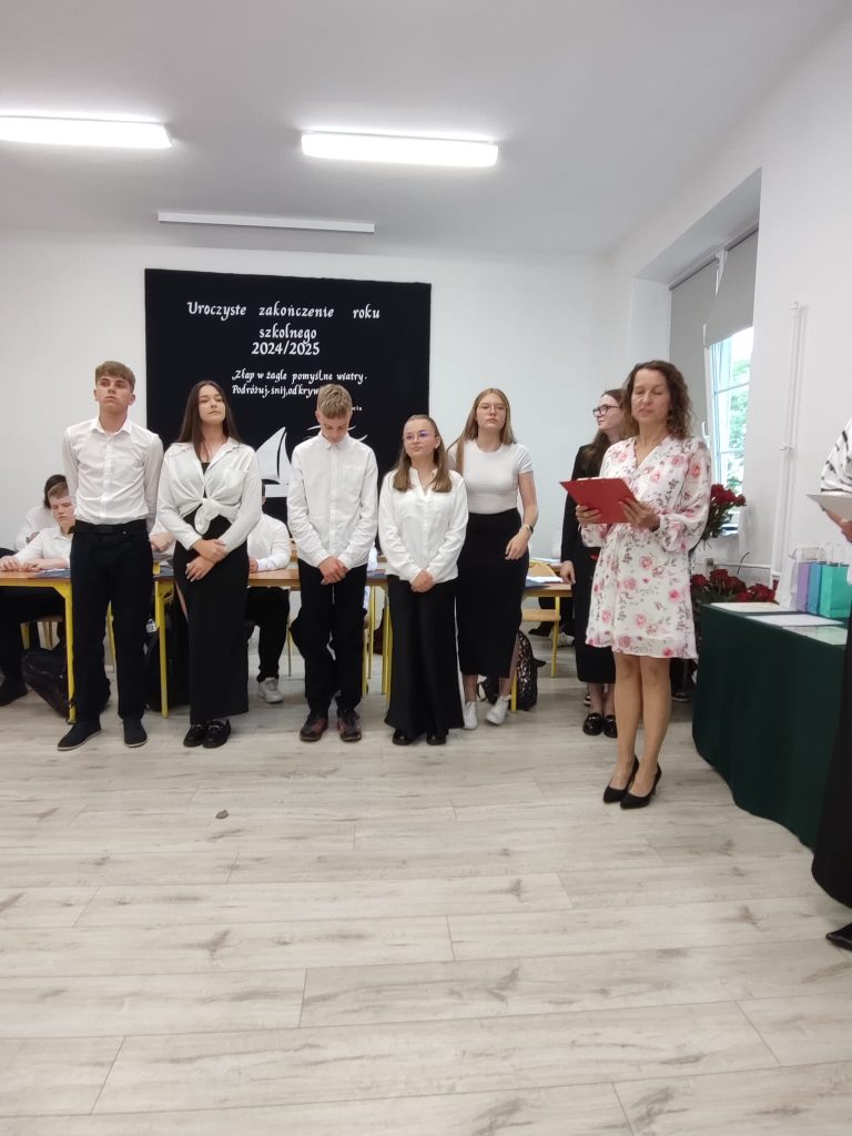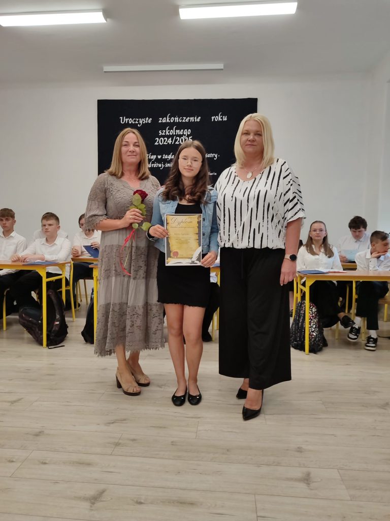 27 czerwca 2025 roku odbyło się w naszej szkole uroczyste zakończenie roku szkolnego 2024/2025. Dyrekcja, Nauczyciele, Pracownicy Administracji i Obsługi oraz uczniowie klas I – VIII zebrali się na świetlicy, gdzie odbyła się uroczystość związana z pożegnaniem uczniów klasy VIII. Było to szczególne pożegnanie. Sekretarz – Pan Arkadiusz Klimowski wręczył Nagrodę Wójta Gminy Sierpc za wybitne wyniki w nauce i godne reprezentowanie szkoły uczennicy VIII klasy – Ewelinie Olszewskiej. Pani Dyrektor w swoim przemówieniu pożegnała odchodzących uczniów oraz złożyła podziękowania i życzenia Pracownikom Szkoły, Rodzicom. Po przemówieniach wręczono statuetki, świadectwa oraz nagrody. Wszyscy uczniowie klasy ósmej otrzymali świadectwo ukończenia szkoły. Uczuciu radości towarzyszyła refleksja, że to już pora pożegnania ze szkołą, z wychowawcą, nauczycielami i rówieśnikami. Następnie absolwenci w programie artystycznym ze sporą dozą humoru przedstawili migawki ze szkolnego życia oraz podziękowania dla rodziców, nauczycieli i pracowników szkoły. Na zakończenie wychowawcy klas wręczyli uczniom klas I – VII świadectwa w klasach.