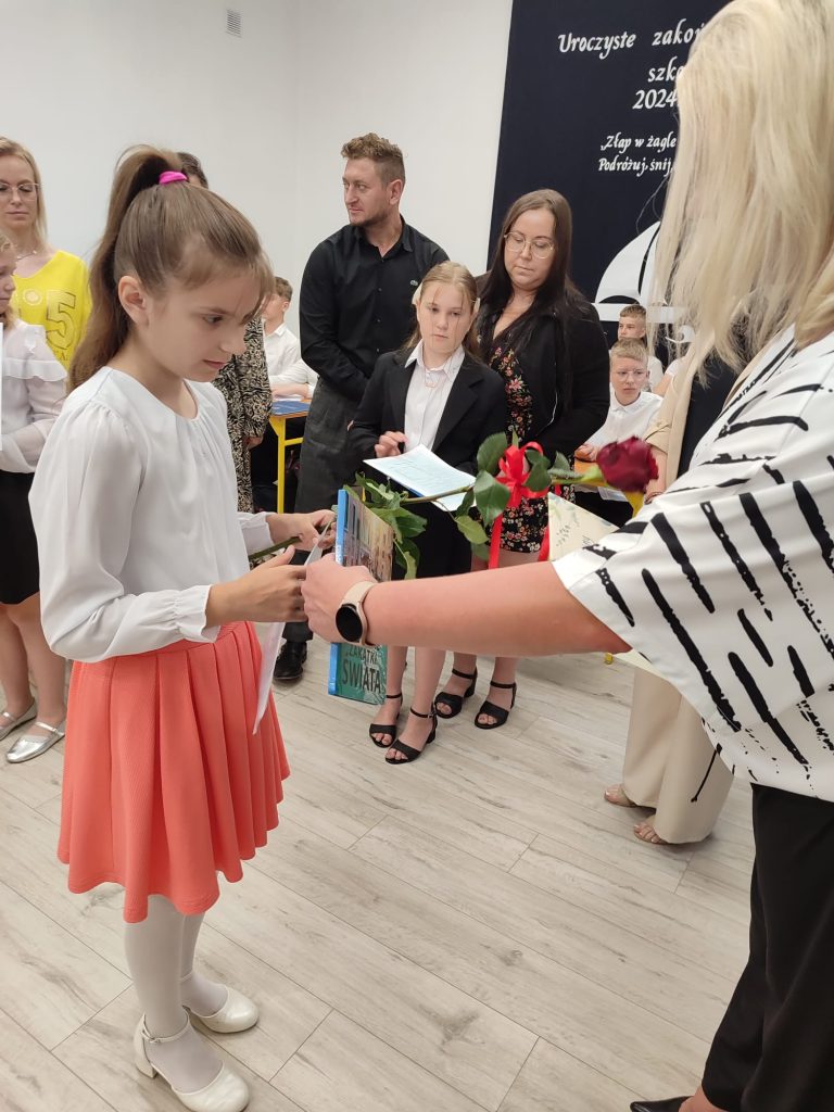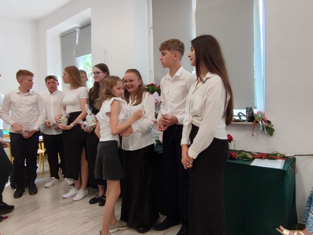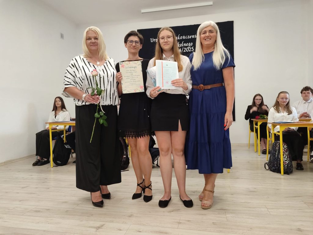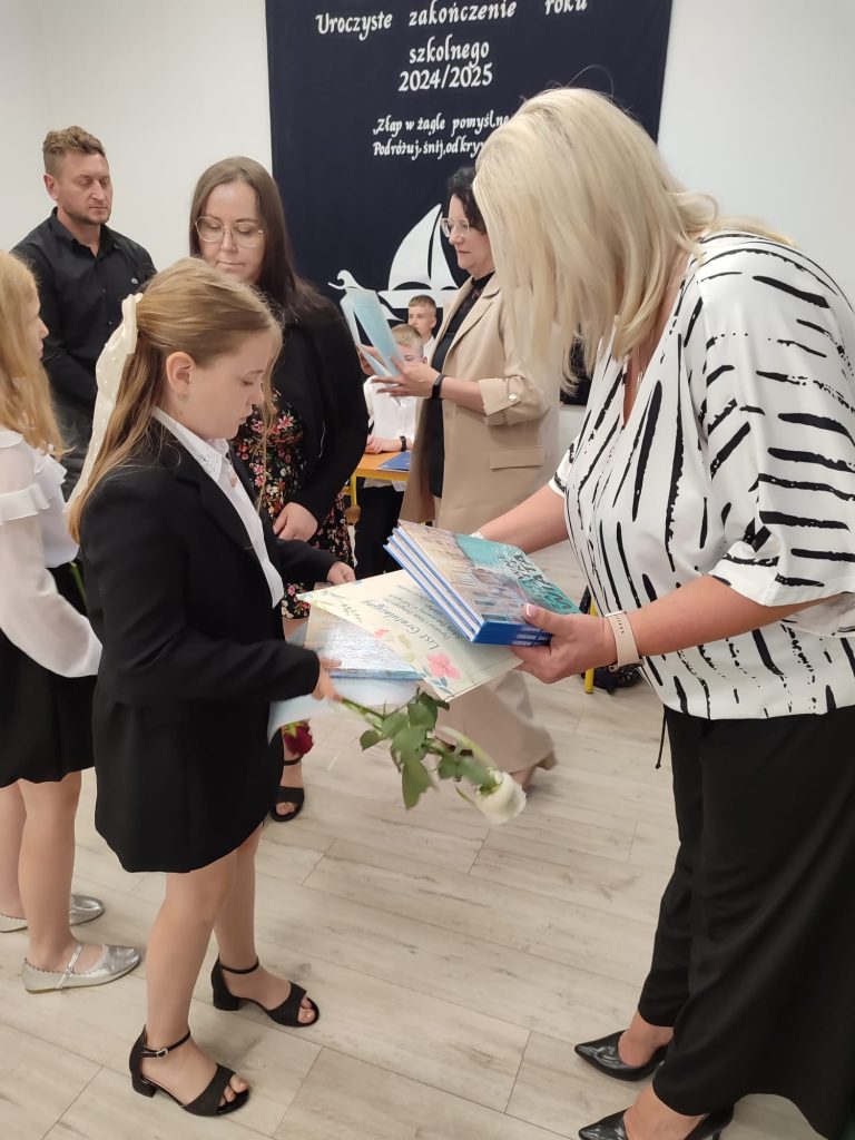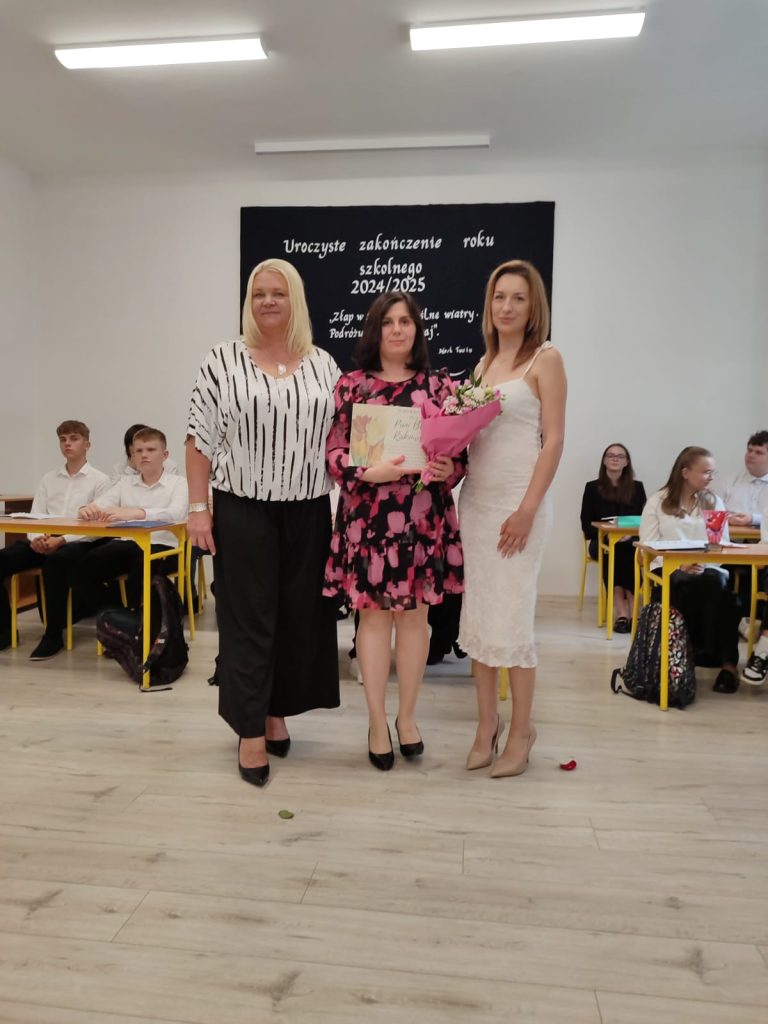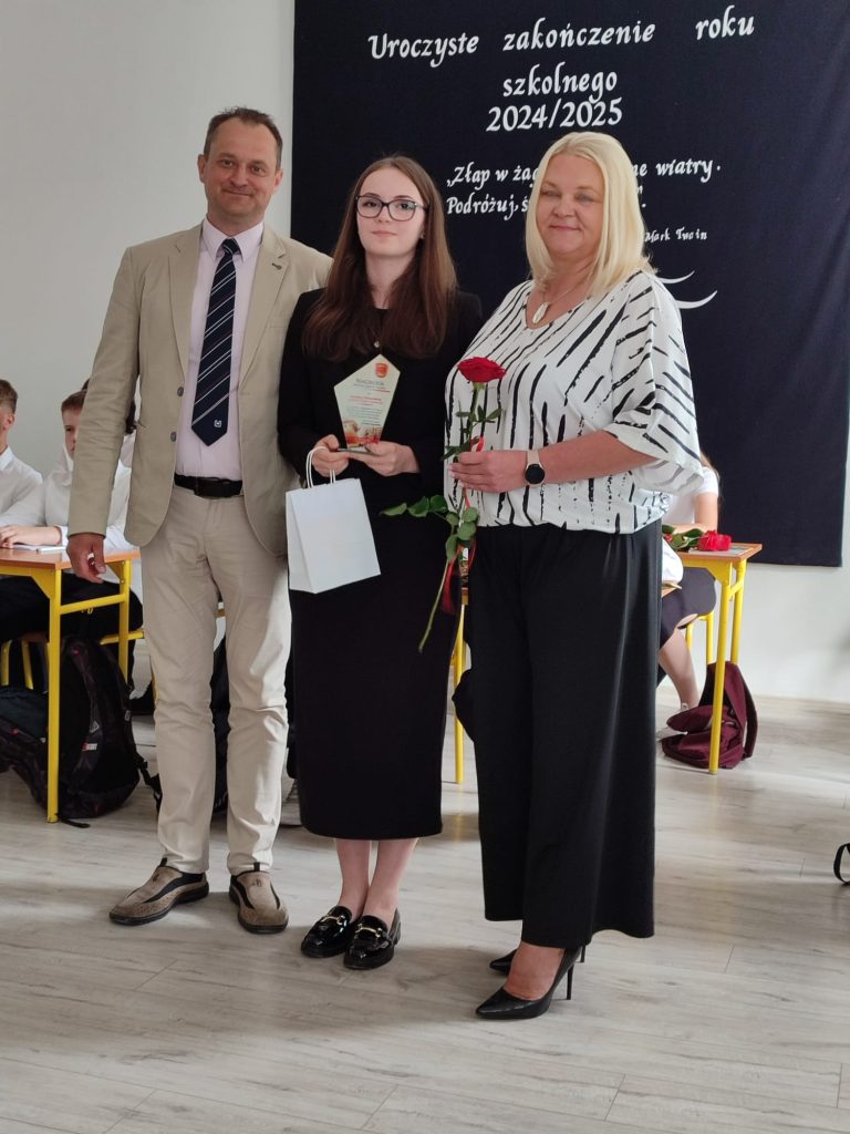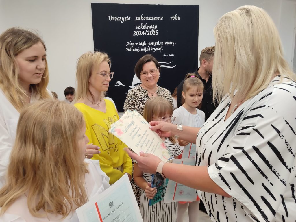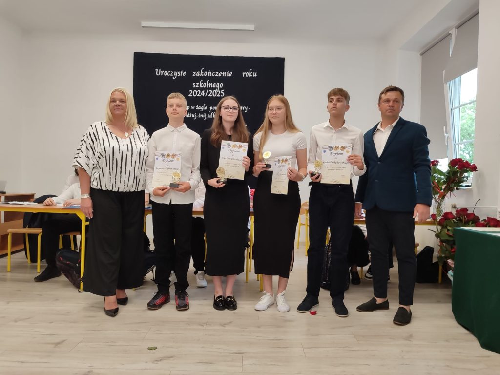 27 czerwca 2025 roku odbyło się w naszej szkole uroczyste zakończenie roku szkolnego 2024/2025. Dyrekcja, Nauczyciele, Pracownicy Administracji i Obsługi oraz uczniowie klas I – VIII zebrali się na świetlicy, gdzie odbyła się uroczystość związana z pożegnaniem uczniów klasy VIII. Było to szczególne pożegnanie. Sekretarz – Pan Arkadiusz Klimowski wręczył Nagrodę Wójta Gminy Sierpc za wybitne wyniki w nauce i godne reprezentowanie szkoły uczennicy VIII klasy – Ewelinie Olszewskiej. Pani Dyrektor w swoim przemówieniu pożegnała odchodzących uczniów oraz złożyła podziękowania i życzenia Pracownikom Szkoły, Rodzicom. Po przemówieniach wręczono statuetki, świadectwa oraz nagrody. Wszyscy uczniowie klasy ósmej otrzymali świadectwo ukończenia szkoły. Uczuciu radości towarzyszyła refleksja, że to już pora pożegnania ze szkołą, z wychowawcą, nauczycielami i rówieśnikami. Następnie absolwenci w programie artystycznym ze sporą dozą humoru przedstawili migawki ze szkolnego życia oraz podziękowania dla rodziców, nauczycieli i pracowników szkoły. Na zakończenie wychowawcy klas wręczyli uczniom klas I – VII świadectwa w klasach.