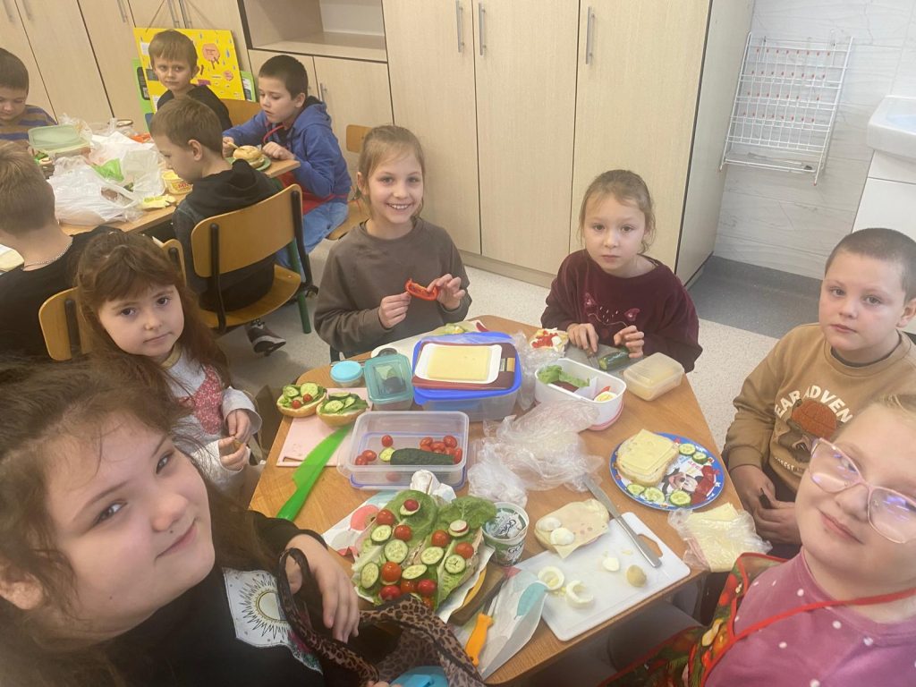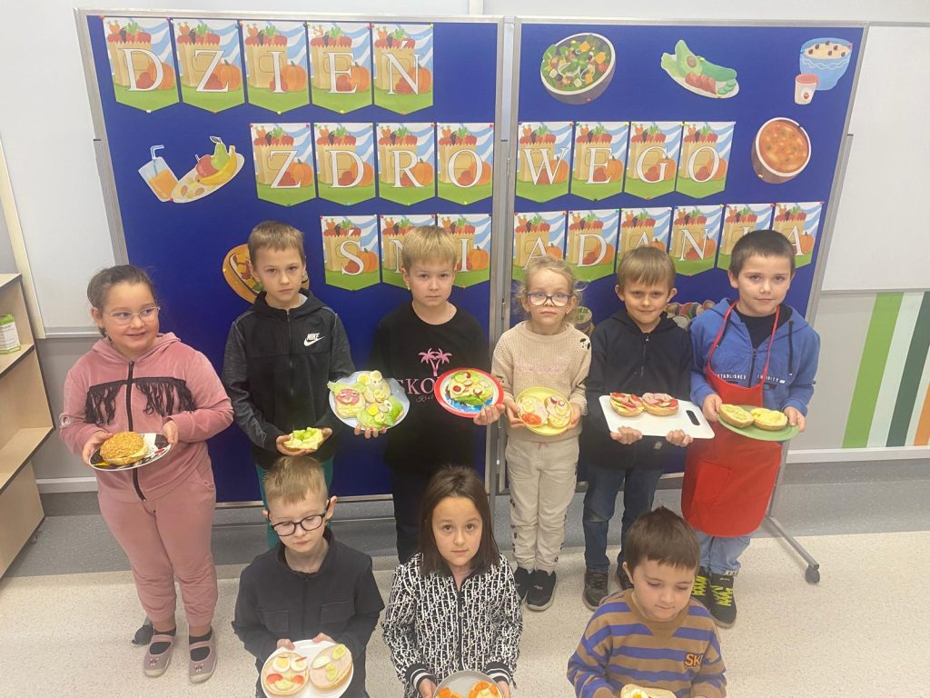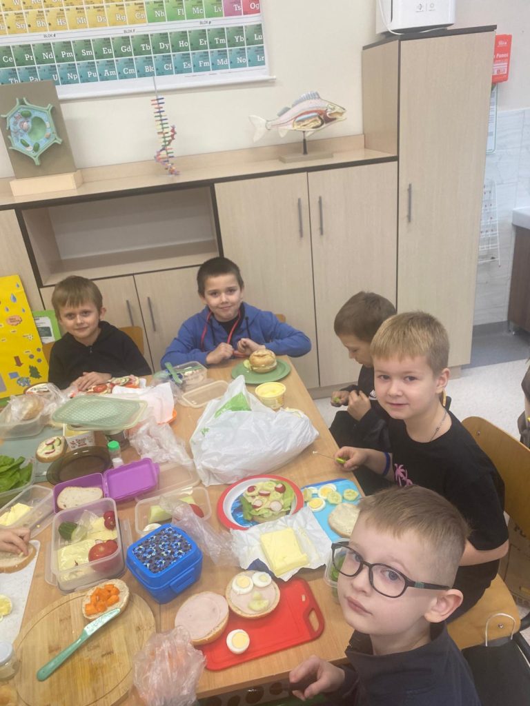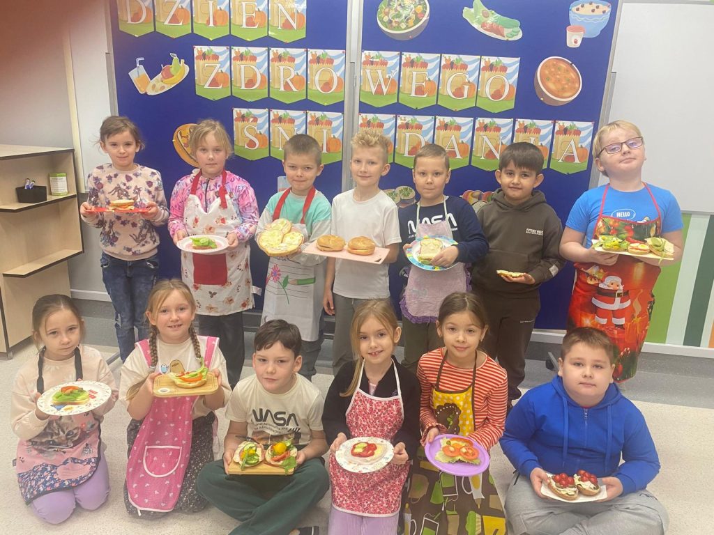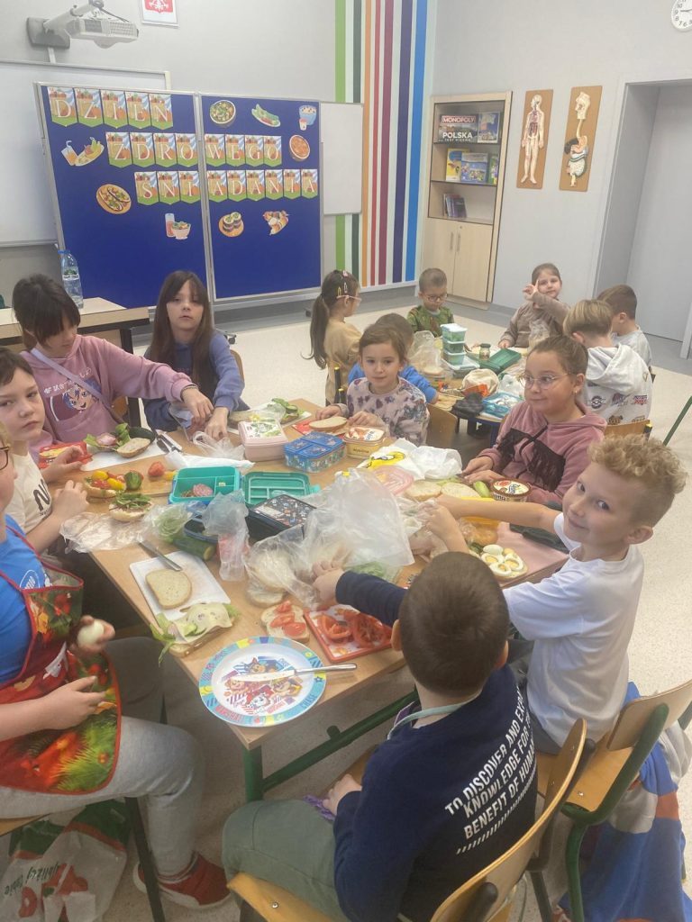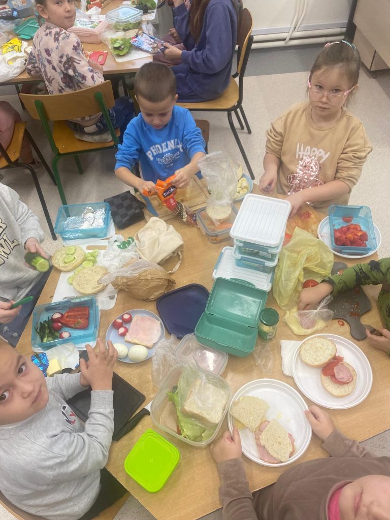 14 listopada uczniowie oddziału przedszkolnego oraz klas I-III obchodzili Dzień Zdrowego Śniadania. Od samego rana dzieci przygotowały śniadanie, komponowały pyszne i zdrowe kanapki. Uczestniczyły też w pogadance na temat znaczenia zdrowego odżywiania dla ich właściwego rozwoju. Na stole pojawiły się kolorowe warzywa, zdrowe wędliny oraz sery. Takie śniadanie daje dobry start na cały dzień, więc wszyscy nabrali dużo energii i siły.